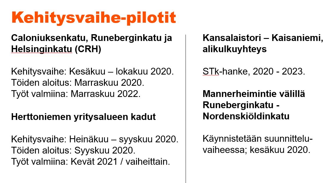 Myös Caloniuksenkadun, Runeberginkadun ja Helsinginkadun uudistus sekä Herttoniemen yritysalueen katu-urakka ovat testikohteita. Niiden kehitysvaiheet käynnistyvät heinäkuussa. Caloniuksenkadun urakka on vielä perinteinen kiinteähintainen kokonaisurakka, joka muokataan kuitenkin tavoitehintaiseksi. STk-urakkaa ei ollut tarkoituksenmukaista käyttää, koska perussuunnitteluun ei ole tarkoitus enää puuttua.