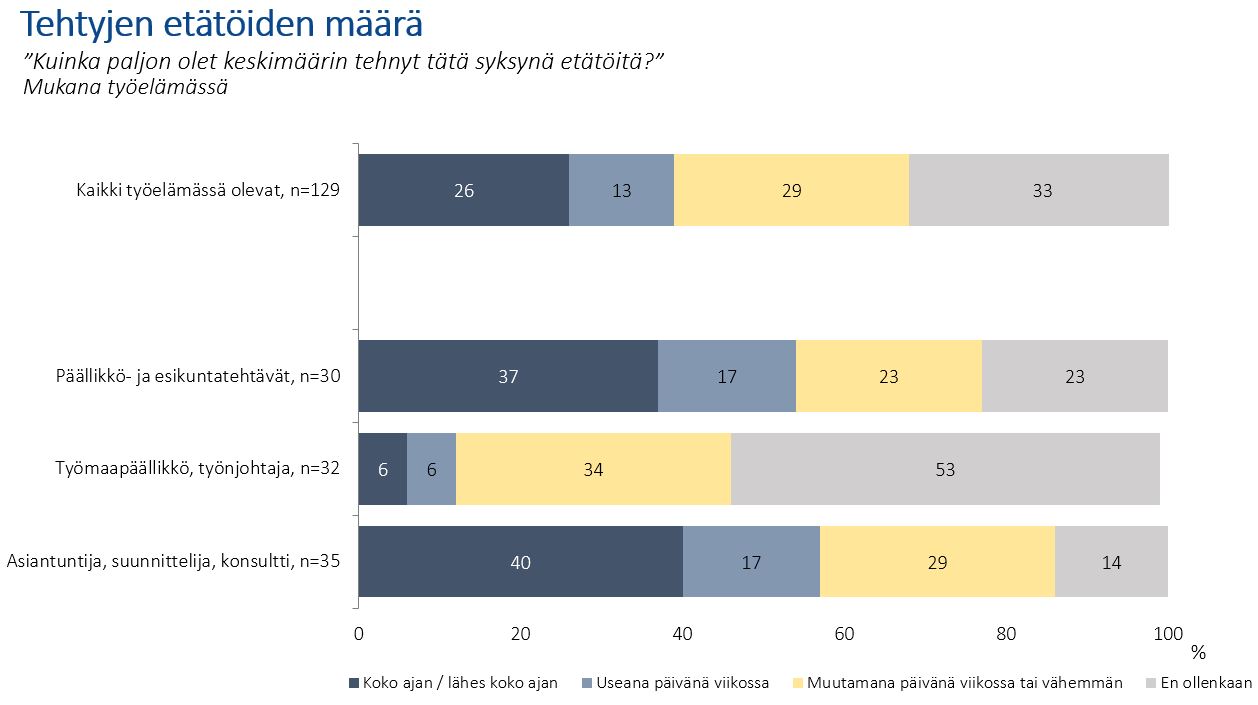 Tutkimuksen etäjohtamisesta tehnyt kehitysjohtaja Johanna Saarinen Vaisalasta sanoi, että jatkuva virtuaalinen vuorovaikutus väsyttää ja kalenterit täyttyvät kokouksista, vaikka monia asioita voi hoitaa käytävillä huomattavasti nopeammin.