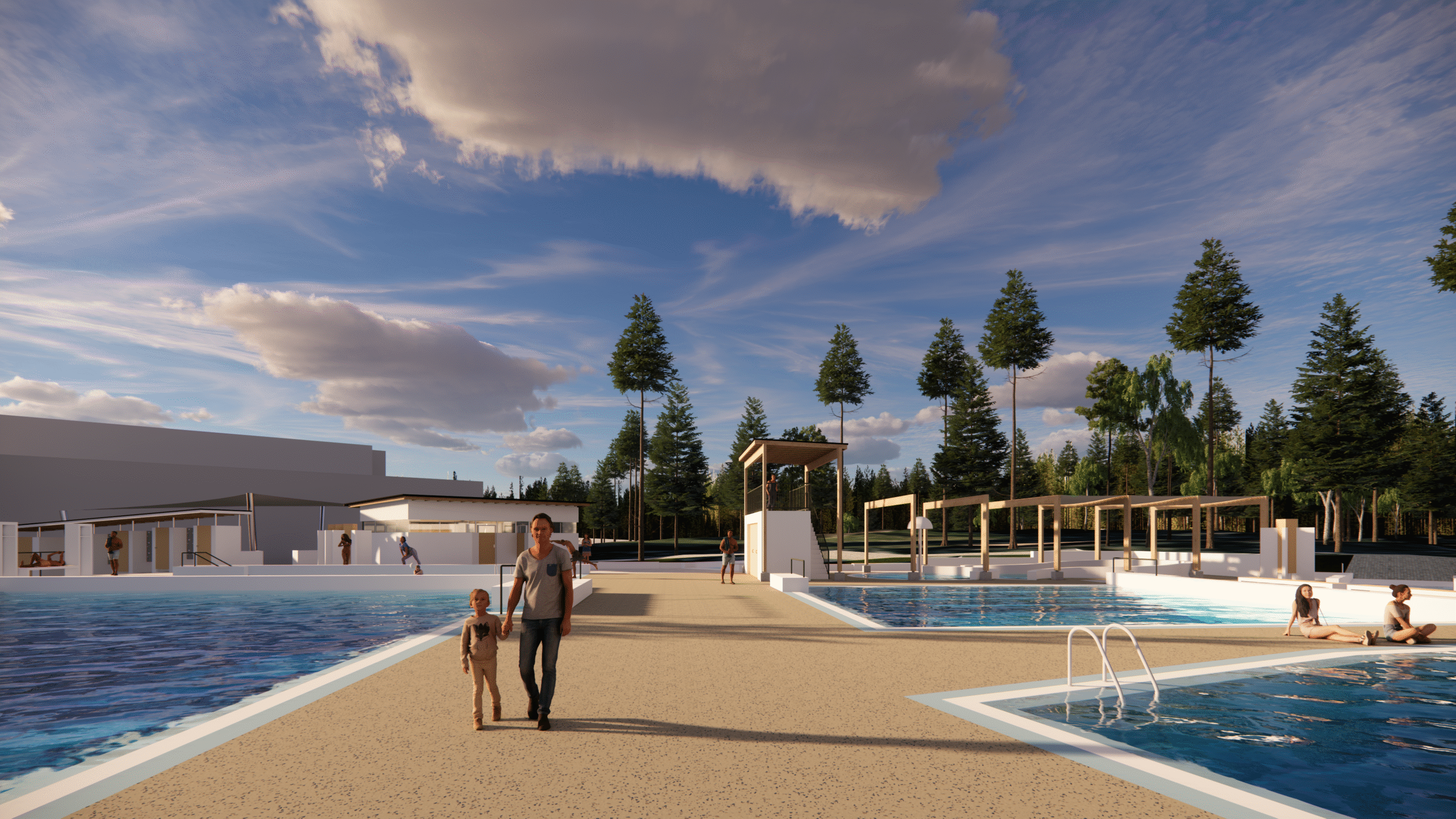 Allasalueelle nousee uusi valvomorakennus, johon sijoitetaan myös tekniikkatiloja. Lisäksi asiakaspalvelu-, pukeutumis- ja peseytymistilat rakennetaan uudelleen. Vanhat pukukopit ja suihkutilat korvataan modernilla rakennuksella.