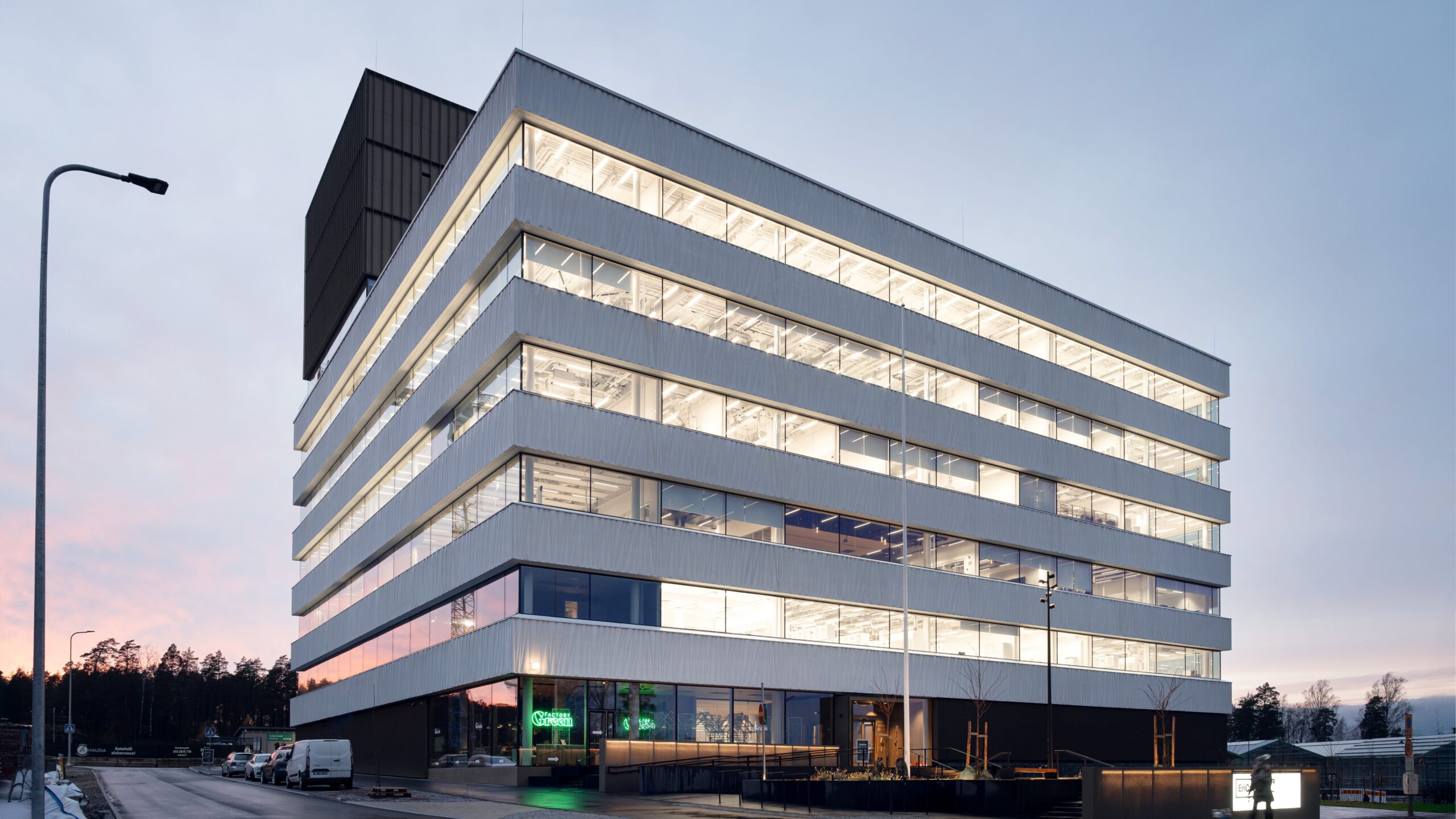 Suorakulmaisen rakennuksen peruskerrosten julkisivut ovat vaaleaa muotobetonia ja lasia.
