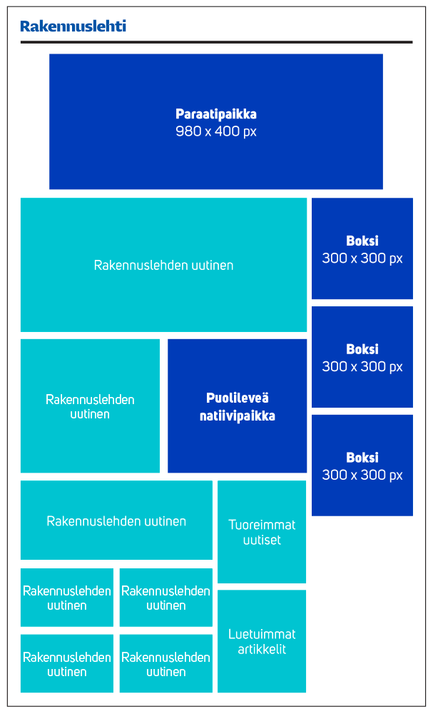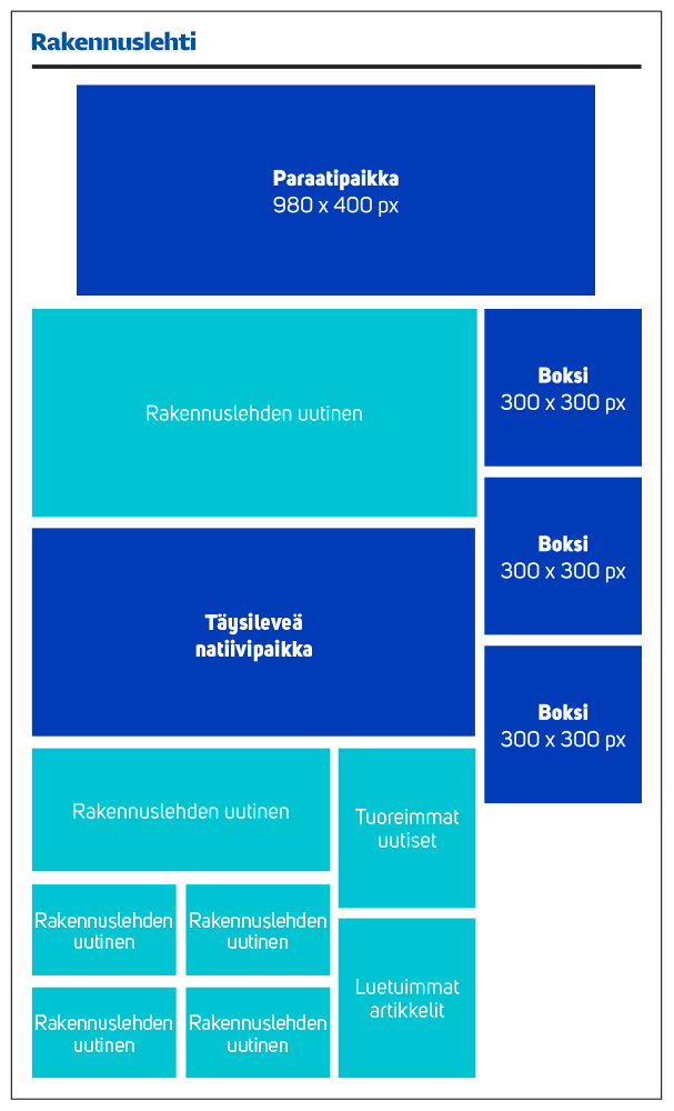 Verkkonatiivi on viikon ajan Rakennuslehden etusivun uutisvirrassa ja se nostetaan mukaan yhteen uutiskirjeeseen. Verkkonatiivi on mahdollista toteuttaa asiakkaan itse tuottamalla sisällöllä tai kauttamme teetetyllä natiiviartikkelilla.